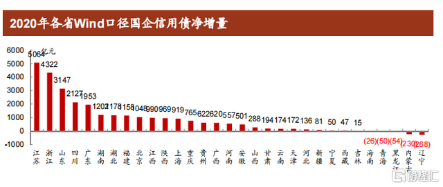 從地方國企的債券凈融資量分布來看,2020年全年呈現(xiàn)凈流出的省份有遼寧、內(nèi)蒙古、黑龍江、青海和海南,另外還有吉林、西藏、寧夏、新疆、河北、天津、甘肅和山西凈融資量低于300億元。