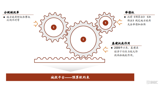 城投平臺(tái)是一種歷史性產(chǎn)物,其產(chǎn)生有三方面的原因:一是分稅制改革下,中央和地方財(cái)權(quán)、事權(quán)的不對(duì)等;二是預(yù)算法和擔(dān)保法規(guī)定地方政府不能舉債、也不能擔(dān)保;三是2008年次貸危機(jī)之后,4萬億政策需要基建發(fā)揮托底作用。此后一旦經(jīng)濟(jì)下行壓力較大,都需要基建發(fā)揮穩(wěn)定器的作用。這使得地方政府事權(quán)增加,投融資需求擴(kuò)張。由于不能舉債,地方政府只能轉(zhuǎn)向金融創(chuàng)新,由此催生了融資平臺(tái)。所以融資平臺(tái)誕生的初衷,是幫助地方政府舉債,而以地方政府信用作為“隱性背書”,依賴地方政府的支持來還債。
