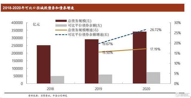 但2018年以后又出現(xiàn)了一些新問題。債券市場(chǎng)“違約潮”的出現(xiàn)引發(fā)了市場(chǎng)恐慌情緒,輕民企重國(guó)企、輕產(chǎn)業(yè)重城投理念的興起,市場(chǎng)投資者信用分層,抱團(tuán)投向城投平臺(tái)。下圖是可比公募債券和城投債的對(duì)比情況,2018—2019年債券增速明顯快于城投債務(wù)增速。
