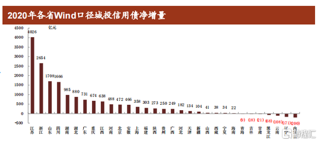 從地方國(guó)企的債券凈融資量分布來看,2020年全年呈現(xiàn)凈流出的省份有遼寧、內(nèi)蒙古、黑龍江、青海和海南,另外還有吉林、西藏、寧夏、新疆、河北、天津、甘肅和山西凈融資量低于300億元。