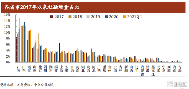 2017年以來天津、內(nèi)蒙、貴州、甘肅及東三省地區(qū)社融占比明顯低于2016年且部分地區(qū)呈現(xiàn)逐年下降趨勢(shì)。從社融增量占比來看,中東部地區(qū)持續(xù)較高,東北、西北等省市持續(xù)較低,其中青海、西藏、寧夏、海南、內(nèi)蒙古、黑龍江和吉林占比持續(xù)較低。另外值得關(guān)注的是,2020年遼寧社融占比下滑十分明顯。