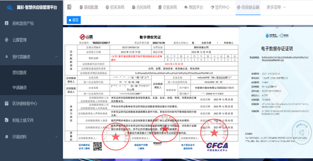“云牒”是以信用為核心、以債權(quán)為實(shí)質(zhì)的新型數(shù)字化憑證,在供應(yīng)鏈金融平臺(tái)中具有債權(quán)多級(jí)流轉(zhuǎn)、無(wú)限拆分、不可篡改、申請(qǐng)融資等諸多特點(diǎn)。通過(guò)供應(yīng)鏈金融平臺(tái)的運(yùn)營(yíng),不但可以打通企業(yè)、產(chǎn)業(yè)與銀行、證券、商業(yè)保理、融資擔(dān)保等金融機(jī)構(gòu)之間的合作關(guān)系,同時(shí)極大的豐富了企業(yè)支付策略、融資策略、合作策略,從而推動(dòng)商業(yè)模式的創(chuàng)新,有效解決中小微企業(yè)融資難、融資貴、融資慢等問題,真正實(shí)現(xiàn)“電子債權(quán)憑證,信用鏈?zhǔn)絺鬟f,服務(wù)實(shí)體企業(yè),創(chuàng)造社會(huì)價(jià)值”。