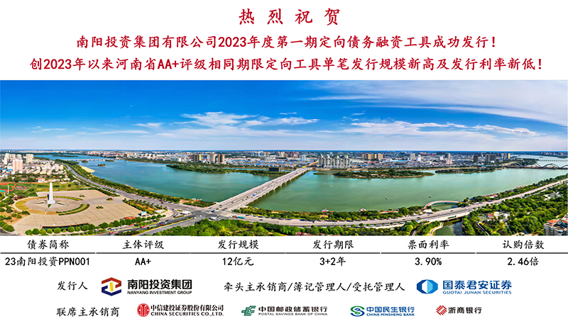 10月26日,南陽投資集團2023年第一期定向融資工具(23南投集團PPN001)成功發(fā)行,金額12億元,期限3+2年,票面利率3.90%,全場倍數(shù)2.46倍,聯(lián)席主承銷商為國泰君安證券、中信建投證券、郵儲銀行、民生銀行、浙商銀行,創(chuàng)2023年以來河南省AA+評級相同期限定向工具單筆發(fā)行規(guī)模新高及發(fā)行利率新低!