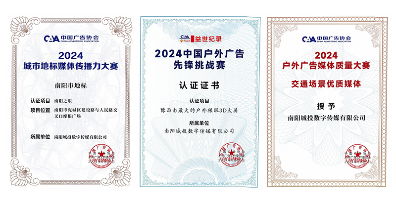 數(shù)字傳媒作為國(guó)有平臺(tái)運(yùn)營(yíng)公司,是南陽戶外廣告特許經(jīng)營(yíng)權(quán)單位,始終堅(jiān)持“政府使命、企業(yè)屬性”,積極踐行“提升城市公共空間環(huán)境品質(zhì),助力現(xiàn)代化省域副中心城市建設(shè)”的使命要求,持續(xù)探索深挖,致力南陽戶外廣告媒體數(shù)字化轉(zhuǎn)型升級(jí)。公司旗下繁華核心商業(yè)圈的“南陽之眼”戶外裸眼3D大屏榮膺“2024年中國(guó)戶外廣告先鋒挑戰(zhàn)賽豫西南最大戶外裸眼3D大屏認(rèn)證”“2024年城市南陽城市之眼地標(biāo)媒體認(rèn)證”雙認(rèn)證。同時(shí)憑借交通場(chǎng)景媒體優(yōu)勢(shì),榮獲“2024年戶外廣告媒體大賽交通場(chǎng)景優(yōu)質(zhì)媒體”獎(jiǎng)項(xiàng)。