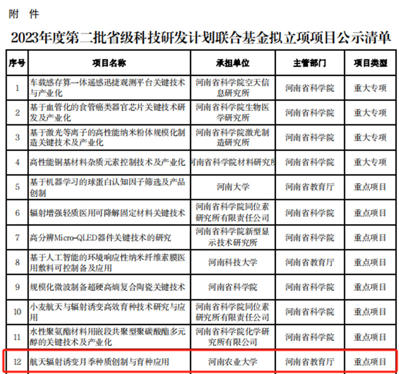 本次航天輻射誘變?cè)录咀兎N項(xiàng)目是祥龍公司與河南農(nóng)業(yè)大學(xué)等校企單位共同申報(bào)的科技攻關(guān)項(xiàng)目,于2024年1月15日完成協(xié)議簽訂;3月5日,南陽(yáng)投資集團(tuán)《關(guān)于申請(qǐng)航天輻射誘變?cè)录痉N質(zhì)創(chuàng)制與育種應(yīng)用項(xiàng)目支持的請(qǐng)示》得到市政府批示;7月5日,祥龍公司與南陽(yáng)農(nóng)業(yè)職業(yè)學(xué)院聯(lián)合參加河南省科技廳組織的專家現(xiàn)場(chǎng)答辯,在208個(gè)申報(bào)項(xiàng)目、131個(gè)資格審查通過(guò)的重點(diǎn)項(xiàng)目中評(píng)審?fù)ㄟ^(guò)48個(gè)重點(diǎn)項(xiàng)目(全?。晒Λ@得科研基金立項(xiàng),項(xiàng)目可研基金100萬(wàn)元。