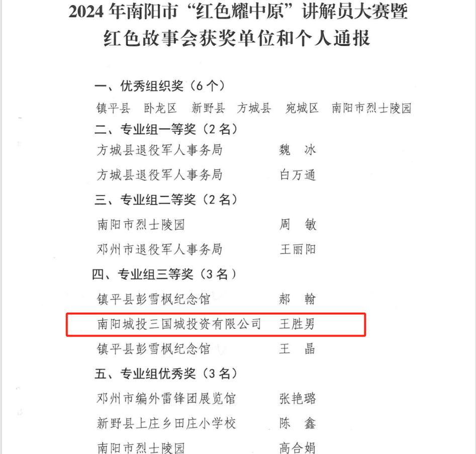 近日,三國城公司雙喜臨門,捷報(bào)頻傳,在多項(xiàng)評選中脫穎而出,接連榮獲“南陽市第二屆工銀杯‘紅色耀中原’講解員大賽暨紅色故事會”三等獎以及“點(diǎn)亮河南文旅新場景·優(yōu)秀景區(qū)”兩項(xiàng)榮譽(yù)獎項(xiàng)。