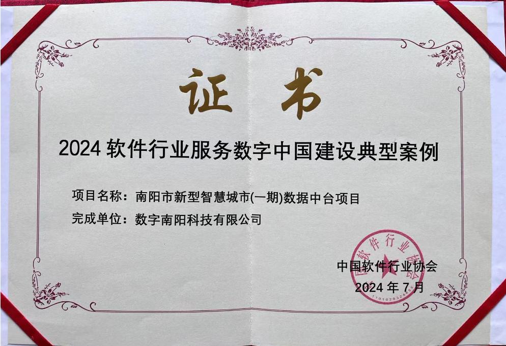 近日,數(shù)字南陽科技有限公司新型智慧城市(一期)數(shù)據(jù)中臺(tái)項(xiàng)目榮獲中國軟件行業(yè)協(xié)會(huì)頒發(fā)的“2024年軟件行業(yè)服務(wù)數(shù)字中國建設(shè)典型案例”榮譽(yù)證書。