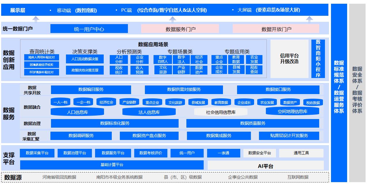 南陽市新型智慧城市(一期)數(shù)據(jù)中臺(tái)項(xiàng)目是我市響應(yīng)數(shù)字政府、智慧城市建設(shè)的重要戰(zhàn)略部署,不僅是全市政務(wù)大數(shù)據(jù)平臺(tái)的核心,也是全市數(shù)字政府和新型智慧城市建設(shè)發(fā)展需要的數(shù)字底座和數(shù)字引擎。該項(xiàng)目主要負(fù)責(zé)數(shù)據(jù)的采集、匯聚、治理、共享、開放存儲(chǔ)與服務(wù),通過多維聚數(shù),初步實(shí)現(xiàn)跨部門、跨層級(jí)的數(shù)據(jù)匯聚與共享,使數(shù)據(jù)互聯(lián)互通,以數(shù)賦能,充分挖掘和釋放政務(wù)數(shù)據(jù)價(jià)值,流程“智”造服務(wù)民生;致力于數(shù)據(jù)的不斷匯聚、高質(zhì)量治理供給和多場(chǎng)景應(yīng)用開發(fā),形成實(shí)時(shí)更新的全域數(shù)據(jù)資源體系和應(yīng)用體系,建立“用數(shù)據(jù)對(duì)話、用數(shù)據(jù)決策、用數(shù)據(jù)服務(wù)、用數(shù)據(jù)創(chuàng)新”的治理機(jī)制,把數(shù)據(jù)聚起來、管起來、存起來,讓數(shù)據(jù)活起來、動(dòng)起來、用起來。