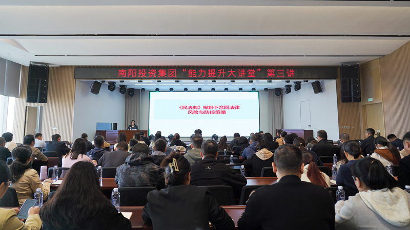 為進(jìn)一步完善風(fēng)險防范體系建設(shè),落實“依法治企、合規(guī)經(jīng)營”的理念,提高干部職工法律風(fēng)險防范及合規(guī)意識水平,10月31日,南陽投資集團(tuán)舉辦“能力提升大講堂”第三講合同法律風(fēng)險與防控策略專題培訓(xùn)。集團(tuán)人力資源總監(jiān)趙書沛,建投公司總經(jīng)理呂秉鈐,部分中層干部及相關(guān)員工90余人參加培訓(xùn),集團(tuán)法務(wù)部經(jīng)理陳麒羽授課。