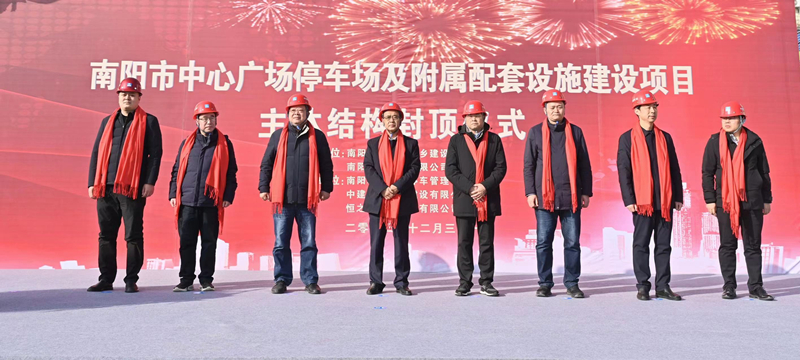 南陽投資集團黨委書記劉九利宣布南陽市中心廣場停車場及附屬配套設施建設項目主體結構封頂儀式正式啟動。