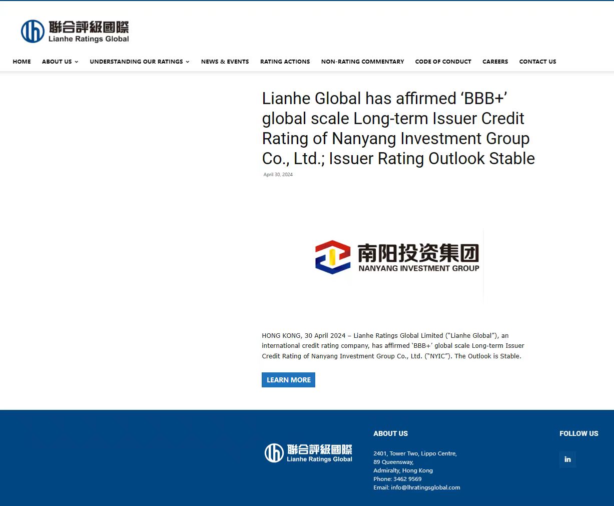 2024年4月30日,經(jīng)聯(lián)合國際評級有限公司評定:授予南陽投資集團(tuán)有限公司“BBB+”的國際長期發(fā)行人評級,展望穩(wěn)定。