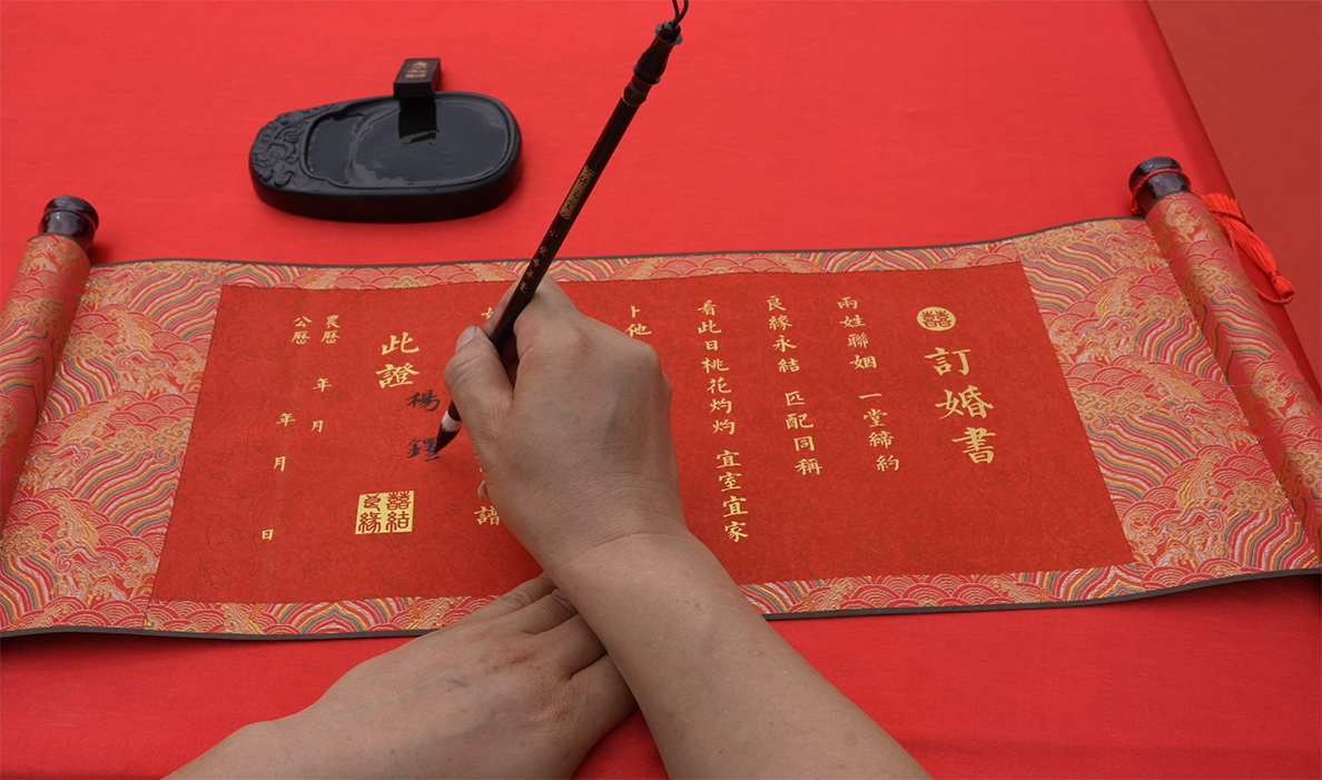 5月20日晨光初綻,20對新人身著漢制婚服,循古禮行沃盥、同牢、合巹之儀,許下“執(zhí)子之手,與子偕老”的誓言?;顒右?ldquo;傳承家風(fēng)文化,倡導(dǎo)婚俗新風(fēng)”為主旨,新人共簽《臥龍婚俗新風(fēng)尚倡議書》,以婚書卷軸為信物,將“忠貞、責(zé)任、擔(dān)當(dāng)”的中華婚戀觀鐫刻于時光長河。