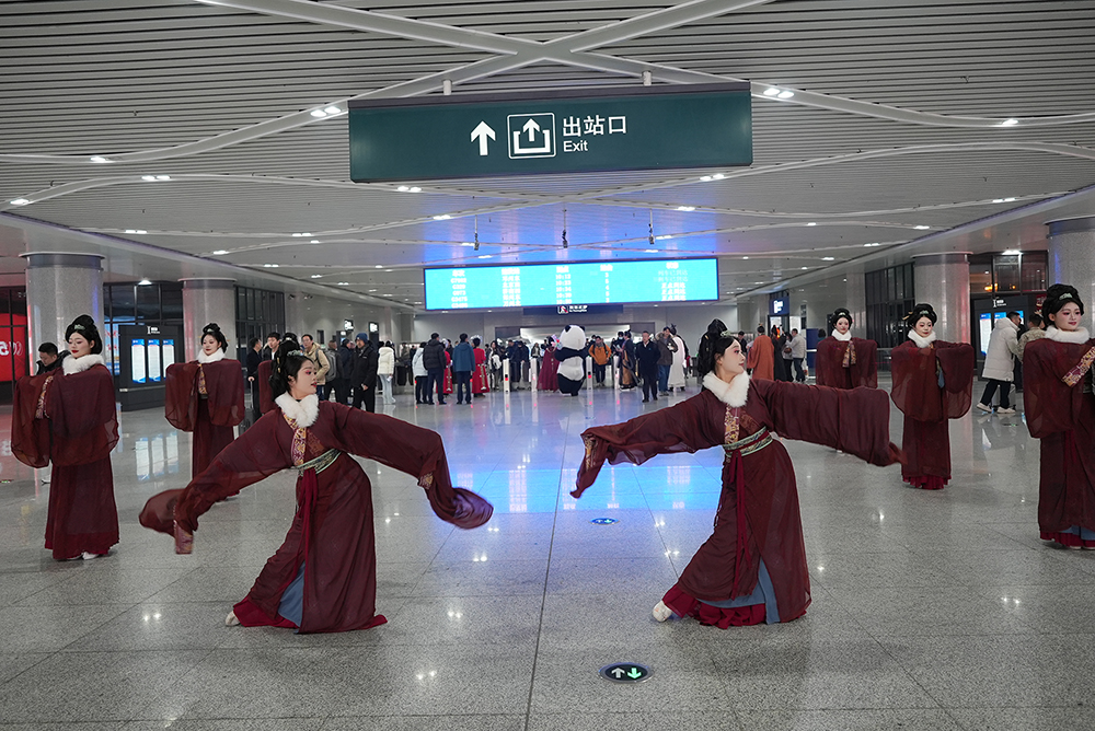 獨(dú)具南陽(yáng)地域特色的原創(chuàng)舞蹈《大美南陽(yáng)·一個(gè)值得三顧的地方》《福佑南陽(yáng)》在站內(nèi)特定區(qū)域精彩上演。舞蹈演員們以優(yōu)美的舞姿,藝術(shù)化地展現(xiàn)了南陽(yáng)的楚風(fēng)漢韻、南都帝鄉(xiāng)的大美南陽(yáng)文化底蘊(yùn),傳遞出祈福納祥、歡迎八方來(lái)賓的美好寓意,吸引了大量旅客駐足觀賞、拍照錄像,將現(xiàn)場(chǎng)氣氛推向高潮。
